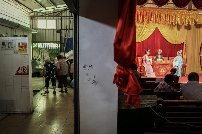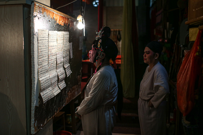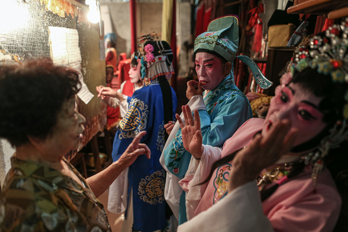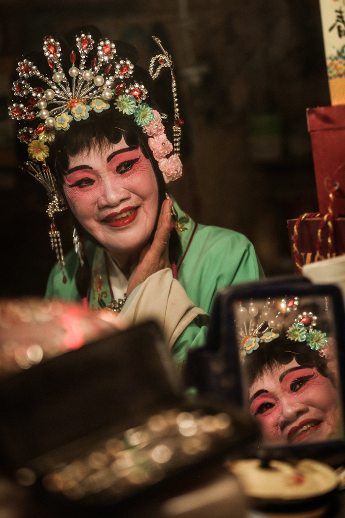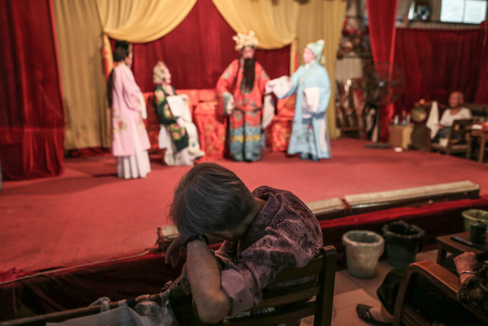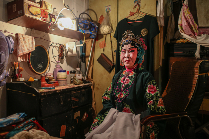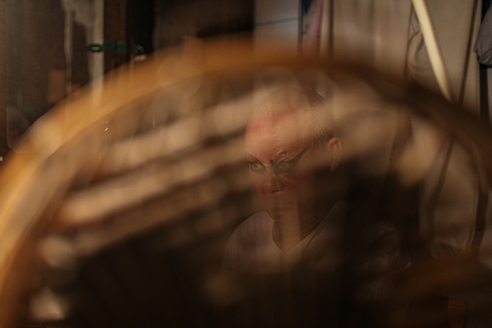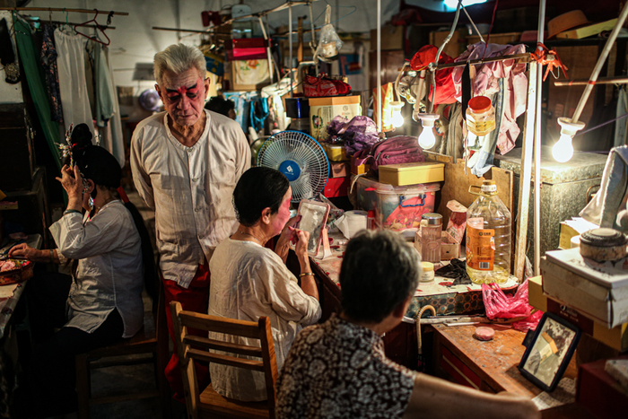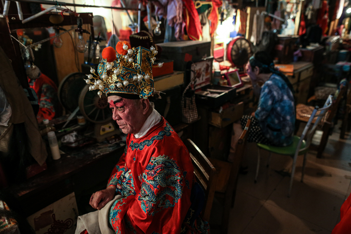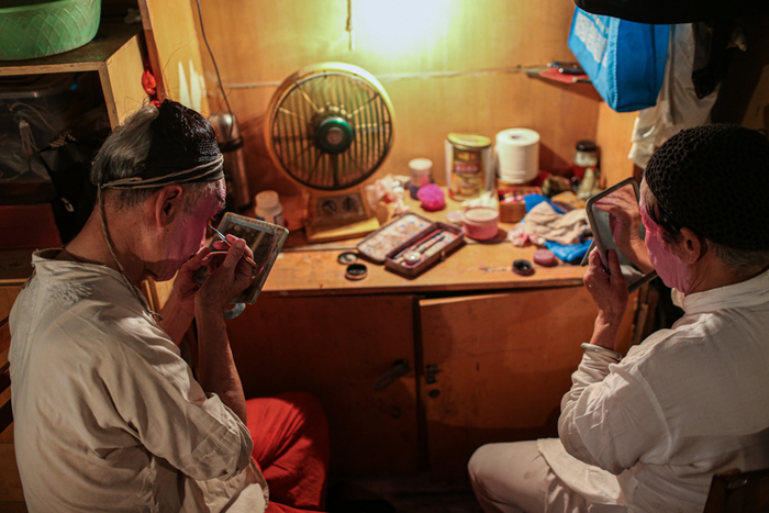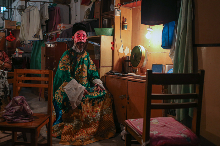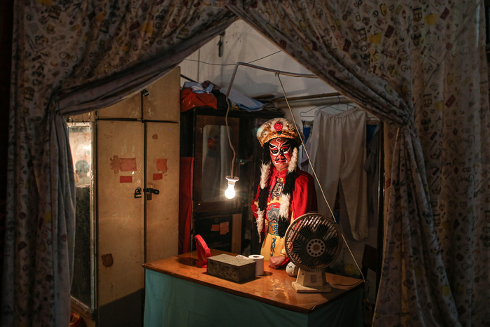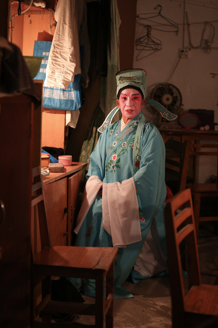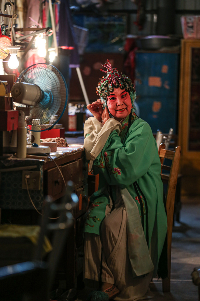 △ 演出开始前,演员们在后台化妆、换装,一位早到的老观众坐在椅子上闭目养神。观众席和后台只是被一块帘布隔开。
