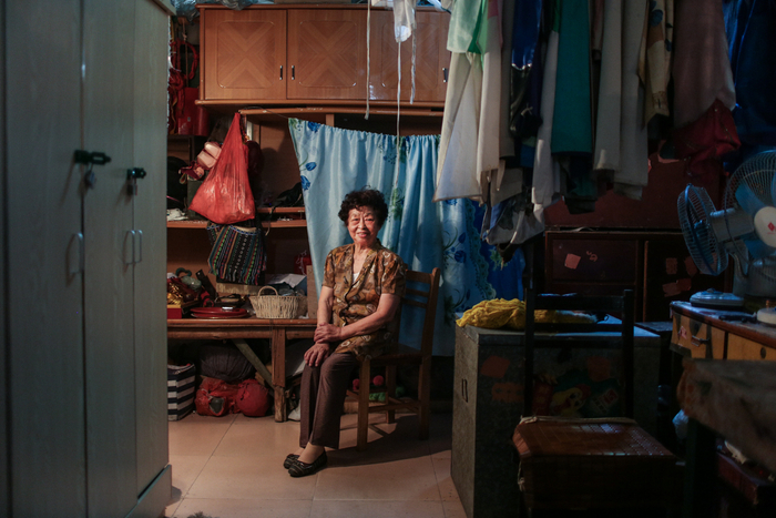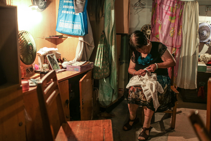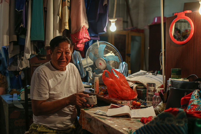 △ 缝补完衣服后,蔡湘琴(右)和老伴沈其林(左)一起化妆,两人都是退休的专业演员。