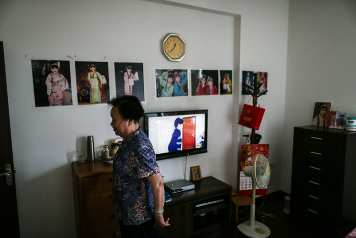△ 不到1点,谭秀华就准备动身去剧场了。这么多年,剧团的老人和她一样从来不睡午觉。谭秀华13岁拜师学艺后便登台表演,她卧室的墙上贴满了多年来演戏的剧照。