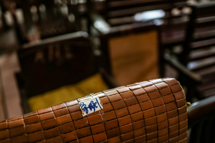 剧场的一角摆放着一把椅子,上面贴了一张写有“秦顺”字样的字条。椅子的主人是秦顺止,今年78岁,原桂剧彩调的专业演员。曾经也是桂彩文苑剧团的一员,去年得了脑血栓,就无法来到剧场唱戏看戏了,位置则一直给他留着。