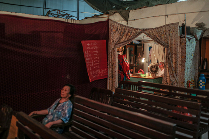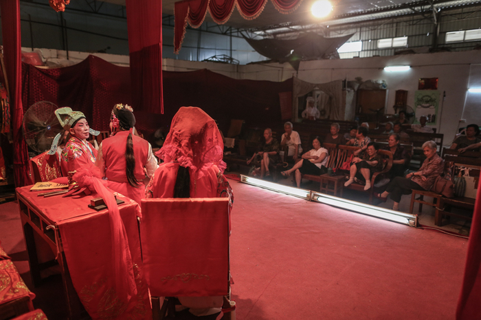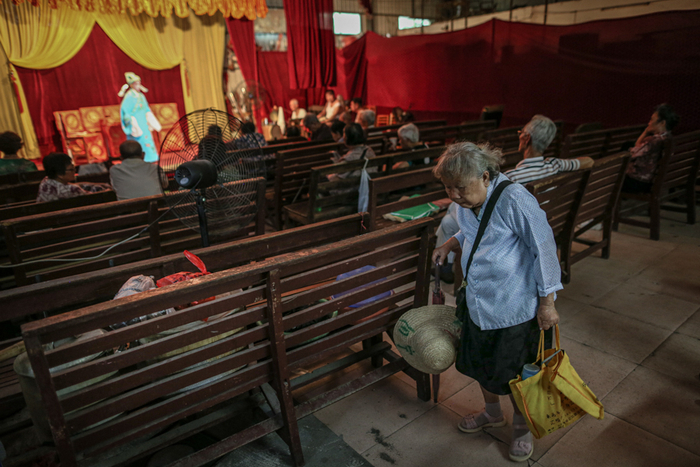 暴雨过后,广西柳州的天气变得炎热起来,广雅综合市场的厂房内气温接近30摄氏度,84岁的桂剧演员谭秀华伴随着几台大的风扇的轰鸣声,踩着乐师的节奏,登上舞台开始了当天的演出。