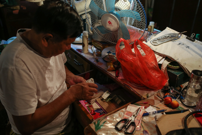 △ 负责售票的朱明田在整理当天的票款。由于经费紧张,他处处都得精打细算。
