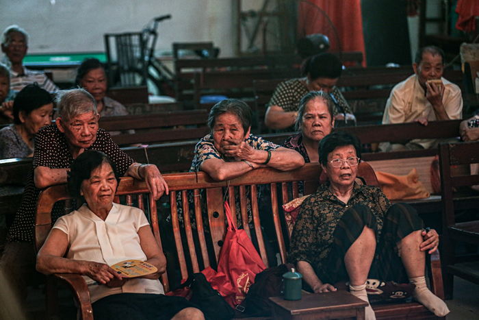 △ 台下看戏的观众们,神态各异。对他们来说,看桂剧是打发时间的一种方式。