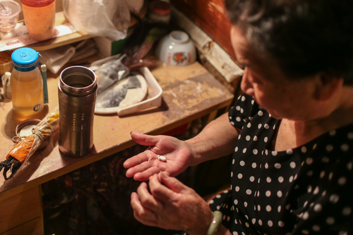 △ 演出开始前,在后台,一位老人正准备将随身携带的药吃了。