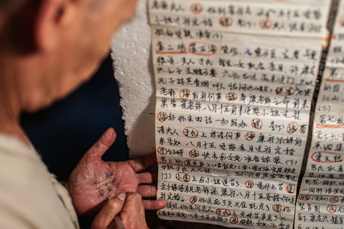 △ 有的老演员怕忘词,会把关键词写在手心上。