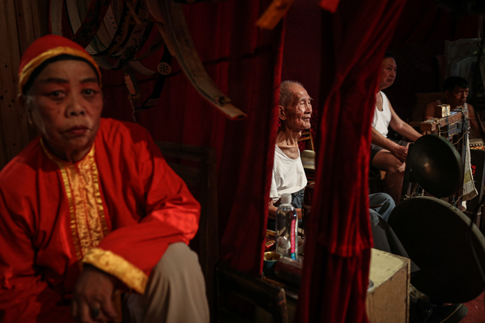 △ 候场中的剧团的乐队,分别是86岁的周伯(右三)、80岁的俞瑞基(右二)、77岁的王国林(右一)。