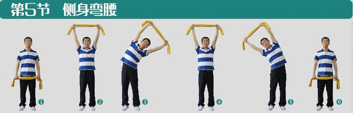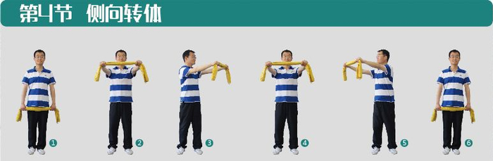一左一右为一次练习,练习4次。待动作练习熟练后,可以适当提高转体幅度,延长拉伸时间。