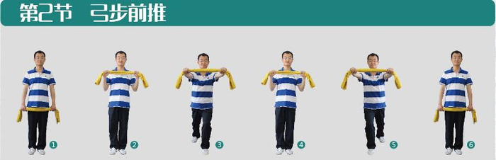 第三步:收回左腿,还原,换右腿练习弓步前推,动作与左侧相同。