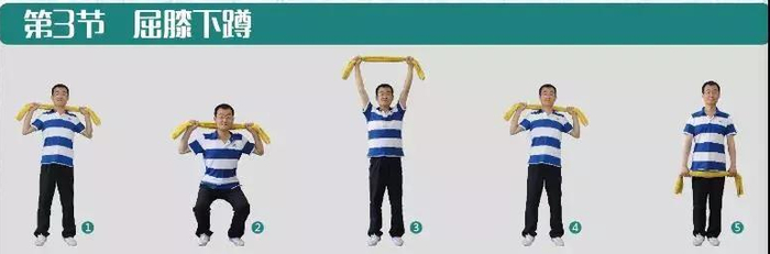 反复练习8次还原,老年人可根据个人情况适当调整练习次数,下蹲幅度。