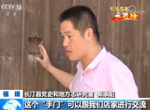 长汀县党史和地方志研究室 郭添阳:我们客家人俗称为“手门”,这个“手门”可以跟我们店家进行交流,我们要买什么物品,将铜板、纸币塞进去,店家就按照这个客人的要求把物品拿出来。我们大多数的“手门”都是属于方形的,唯独这一家他是属于雕花的“手门”。那这个时候我们的地下党员以及交通员的就在这户房子进行接头,在这条街道上看到暗号,就是“手门”要做成与众不同,他就能够明白我们的接头地点就可以确定是在这一家的。