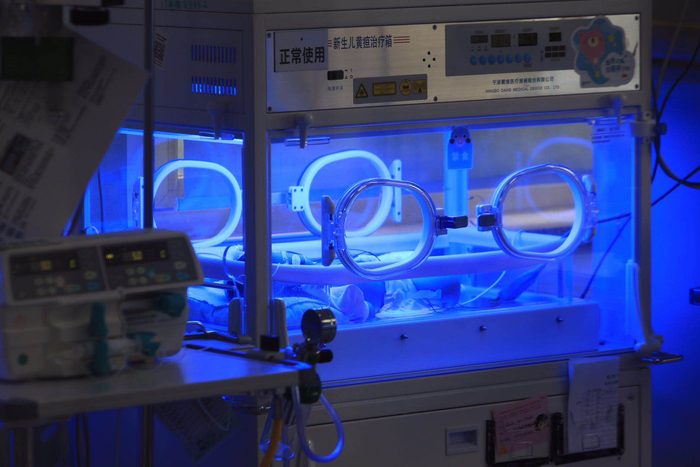 新生儿在新生儿黄疸治疗箱内。新京报记者 王嘉宁 摄