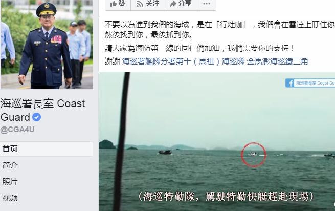 除了刁难雇佣大陆渔工的台籍船长之外,台海巡署长陈国恩还亲自“上阵叫嚣”。在社交网站“脸书”账号“海巡署长室Coast Guard”上,陈国恩17日发文,提及马祖海巡队16日扣押一艘大陆渔船,扬言只要有大陆渔船进入台湾海域“一律强势执法”,还叫嚣“我们会在雷达上盯住你,然后找到你,最后抓到你。”