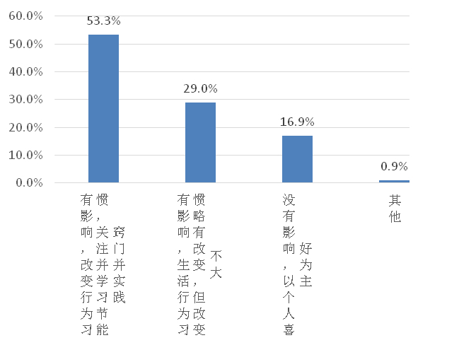 82.3%的居民表示阶梯水、电、燃气价格政策对其有影响,其中53.3%的居民改变了其行为习惯,关注和学习节能窍门并实践,29.0%的居民生活行为习惯略有改变。