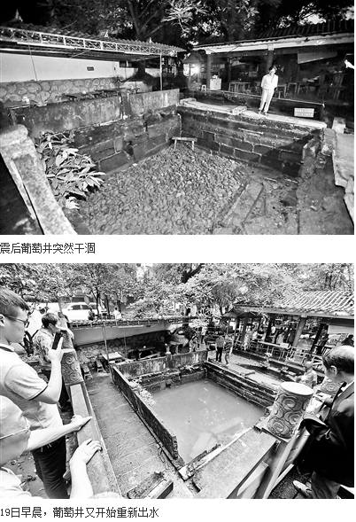 在双河镇当地,有一种由葡萄井井水和大米制作的小吃——葡萄井凉糕。由于井水干涸,很多人担心葡萄井再也不会出水,而地震前制作的一批凉糕也因此被称为“绝版凉糕”。据北青报记者了解,到19日早晨,葡萄井又开始重新出水。