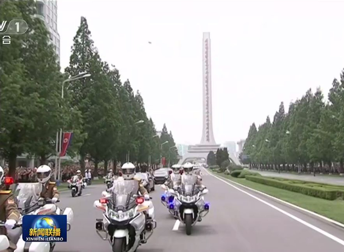 欢迎仪式之后,在21辆礼宾摩托车的护卫下,习近平乘车抵达黎明大街路口,换乘敞篷车,与金正恩同车前往锦绣山太阳宫广场。