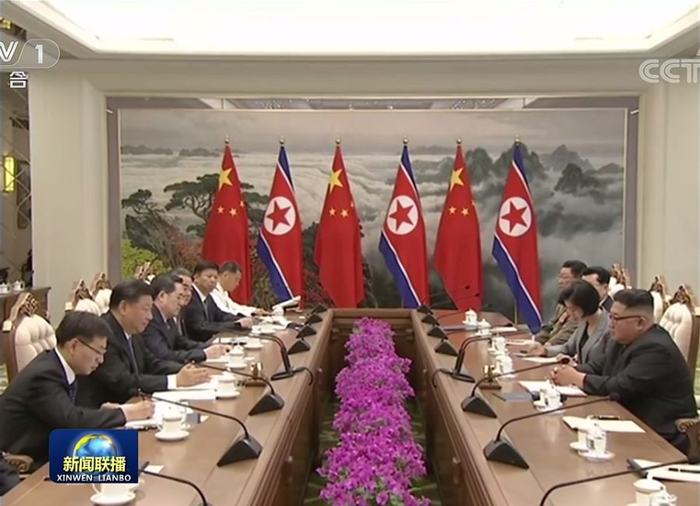 根据《新闻联播》,习近平在会谈中表示,这次是为巩固传承中朝友谊而来,为推动朝鲜半岛问题政治解决进程而来。