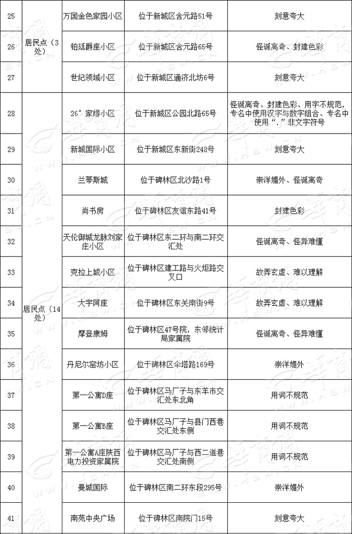 据华商报6月20日报道,近日,多地发布“关于需清理整治不规范地名清单的公示”,公示中提到,各地居民区的名称因为崇洋媚外、怪异难懂等原因将面临清理整治。西安市也公示了一批“大、洋、怪、重”的不规范地名,引发市民广泛关注。