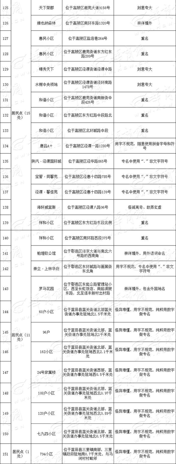 昨日,西安市民政局对区县上报的不规范名单进行了逐一核查,将最开始上报的151个不规范地名缩减到98个。