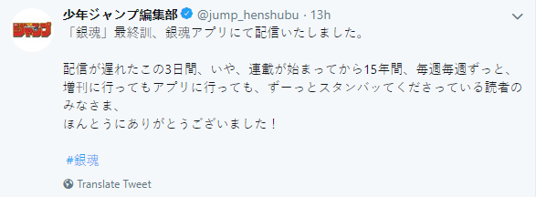 新京报讯 6月20日,由日本漫画家空知英秋创作的长篇漫画《银魂》发布了最终话,《少年Jump》的官方推特也向15年中一直守候着《银魂》的粉丝们表达了感谢。
