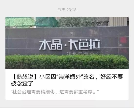 报道称:香缇半岛、京都城、铂金府邸、中瑞·曼哈顿……这些在广告上耳熟能详的楼盘名字,即将成为记忆。市地名办透露,这些楼盘的名称不符合规定,在申报地名时过不了关,必须改名。据了解,“香缇半岛”改称“香缇锦园”,“京都城”改称“新京都家园”,“铂金府邸”改称“铂金家园”,“中瑞·曼哈顿”改称“中瑞·曼哈屯”,“香滨左岸”改称“香滨左岸锦园”