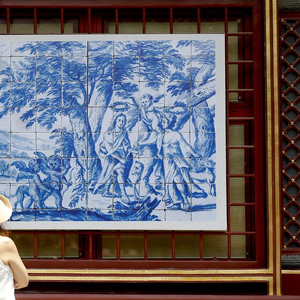 葡萄牙被誉为“瓷板画王国”。葡萄牙语Azulejo(瓷砖)来源于阿拉伯单词Al-zuleique,意思是“光滑的小石头”。工匠使用瓷砖装饰的地板和墙壁得到了葡萄牙国王们的赞赏,因而从15世纪开始,这种工艺在建筑上逐渐占据重要地位。比如这次故宫展览中,你可以看到构图严谨、装饰性强的16世纪早期瓷板画,属于基督教艺术与伊斯兰艺术的混合体;17世纪瓷板画上的“狩猎图”,色彩搭配协调、画面干净明快;18世纪的一幅作品,勾画出葡萄牙人想象中的中国人生活场景,勤勉做着家务的夫妻、吹着笛子与女孩玩耍的妈妈等。实际上,如果去葡萄牙旅行,无论在何处,都不可能错过瓷砖。瓷砖跨越各个时代的风格和语言,用五颜六色描绘着路面和参观地。