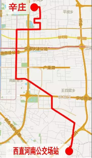 [中途设站]:辛庄、豆各庄、豆各庄路口南、石佛营东里、石佛营西里东站、石佛营西里、高庙、八里庄北里、八里庄北里东站、农民日报社北、农民日报社、八里庄南里、红领巾公园、延静里、金台路口东(西直河南公交场站→辛庄)、金台路口南、红庙路口北、八王坟北、八王坟南、北京东站北、九龙山、珠江帝景、平乐园北、平乐园小区、窑洼湖桥东、朝阳区大柳树西站、朝阳区大柳树、垡头桥南、垡头北站、垡头、垡头南站、工业技师学院、西直河北站、北京焦化厂、西直河、西直河南站、西直河南公交场站。