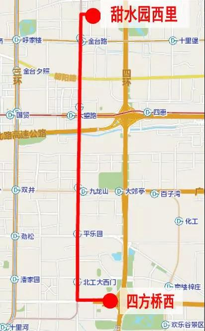 [增设站位]:四方桥西、北京工业大学南门、北京工业大学南站(四方桥西→甜水园西里)、松榆东里东门、北京东站北(四方桥西→甜水园西里)、八王坟北(甜水园西里→四方桥西)、金台路口北(四方桥西→甜水园西里);