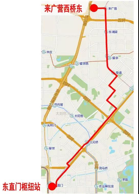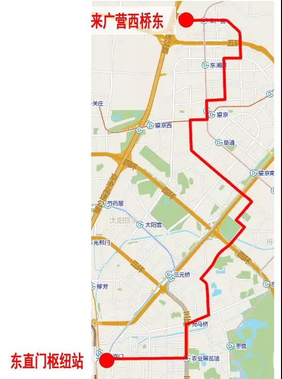 调整后首末站:东直门枢纽站-大西洋新城南门
