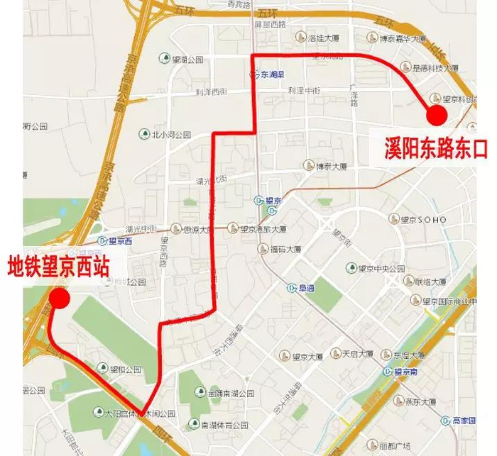 [增设站位]:南湖南路北口(溪阳东路东口→地铁望京西站)、湖光中街西口(地铁望京西站→溪阳东路东口)、望京桥北(溪阳东路东口→地铁望京西站)、望京桥西(溪阳东路东口→地铁望京西站);