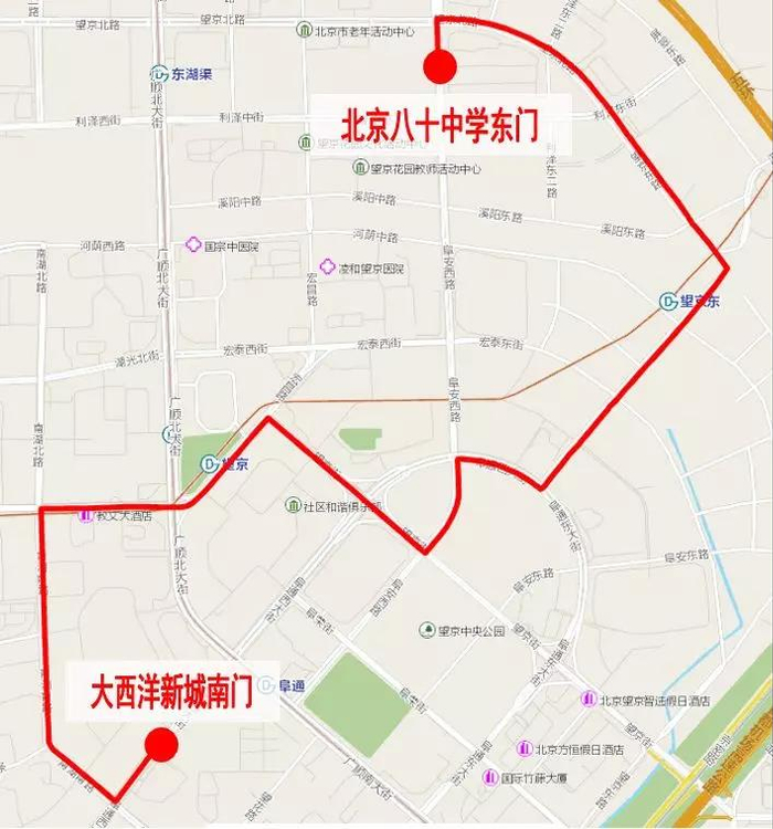 [中途设站]:大西洋新城南门、花家地西里、南湖南路、南湖南路北口、湖光中街东口、地铁望京站、望京街西口、阜安西路、阜安路、地铁望京东站、溪阳东路东口、利泽东街东口、望京北路东口、北京八十中学东门。