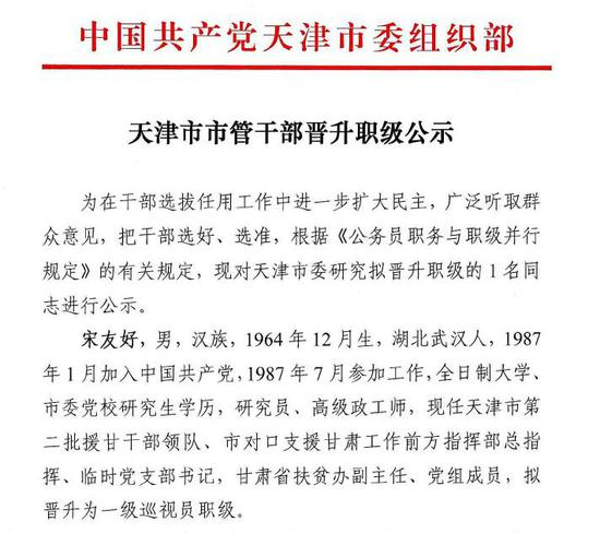 公示挂在甘肃省扶贫办官网上,是天津市委组织部6月13日作出的,其中显示:根据《公务员职务与职级并行规定》的有关规定,现任天津市第二批援甘干部领队、市对口支援甘肃工作前方指挥部总指挥、临时党支部书记,甘肃省扶贫办副主任、党组成员宋友好,拟晋升为一级巡视员职级。
