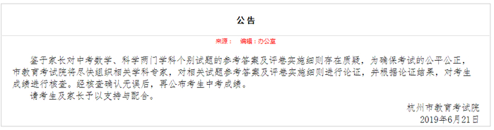 21日,杭州市教育考试院就“家长对中考数学及科学个别试题参考答案及评卷细则存疑”发布公告,称将尽快对相关试题参考答案及评卷实施细则进行论证,并根据论证结果,对考生成绩进行核查。