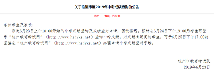 新京报快讯 23日,杭州市教育考试院发布“关于推迟市区2019年中考成绩查询的公告”,公告称原定6月23日上午10:00开始的中考成绩查询及成绩查对申请,因故推迟。预计在6月24日下午19:00后考生可登录“杭州教育考试网”(http://www.hzjyks.net)查询中考成绩。