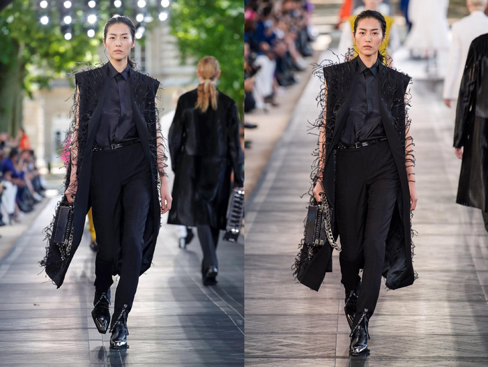 身穿鸵鸟毛无袖长马甲的刘雯像不像疆场上披荆斩棘的战士?一丝不苟的禁欲领口又尽显端庄。全黑的色彩再加上“大表姐”的自信演绎,冷酷中带着神秘,淡然中透着霸气,再加上羽毛修饰,活脱脱一位翩翩贵公子。