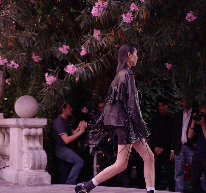 这件皮衣是Versace Menswear 2020春夏款,基础的版型来源于经典,而袖口处的绑带流苏设计则挑战着当下的前卫时尚。浓郁的“机车感”赋予模特一丝叛逆气息,即使是婀娜多姿的身材也能轻松驾驭这硬朗的设计。袖口的流苏随着步伐自然摆动,这大概就是“走路生风”的最好诠释吧。