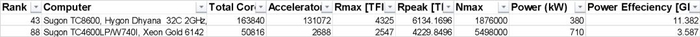 我们还需要看到,由于曙光公司的主要产品线都是基于英特尔的CPU和英伟达的加速器芯片,在这次禁运之后,这些产品线都难以为继了。从商业层面来说,对曙光公司的影响巨大。但是好在曙光有了全国产的CPU和加速器芯片替代产品。我们可以从排名第43的曙光TC8600和排名第88位的曙光TC4600LP/W740l这两台超算的测试数据看出一些细节来:
