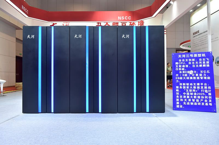 2018年5月19日,国家超算天津中心展示了天河三号原型机,在2018年底投入使用。天河三号的全配置主机计划在2020年投入使用,性能计划为1EFlops。 天河三号将使用国产飞腾FT2000plus或者后续型号的CPU,以及国防科技大学的Matrix2000plus或者后续型号的加速器芯片。