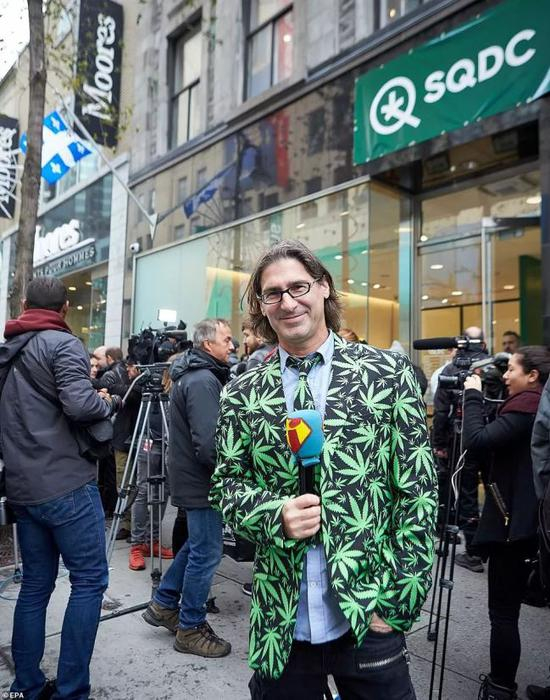记者的西装领带上印着满满的大麻叶