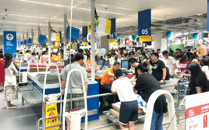 夏至当天晚上近11点,宜家西红门商场熙熙攘攘,结账区排起了长队。 摄影/新京报记者 王琳