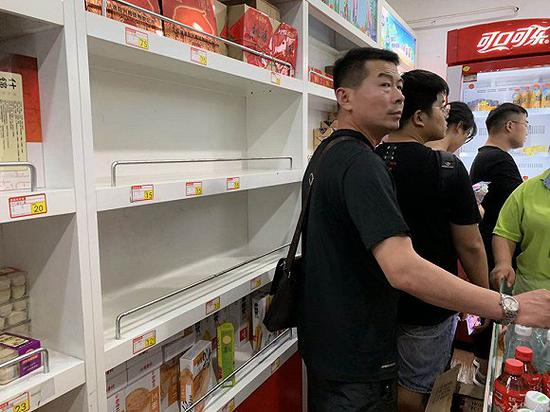 到晚餐时分,仍然没有发车的消息,滞留的乘客们开始寻找食物。二层候车厅的一家小型超市里人头攒动,部分货架和冰箱已经空了。另一家饮品店的玻璃柜内也仅剩下两三个小蛋糕。