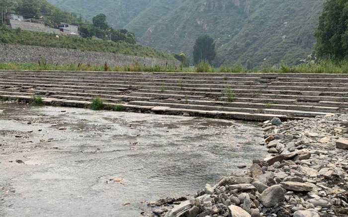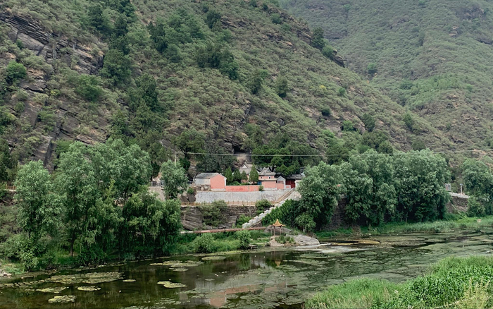 走出老村的北口,是大石河的河床,村民在河边种了玉米、蔬菜,河边可闻鸟鸣见蜻蜓飞,是一片安详的景致。从河的南侧向北望,可以看见位于北侧山间的庙宇,绿水青山中,有一片小型的红色建筑群,是当地有名的古迹“龙神庙”,远观真有一番气象。