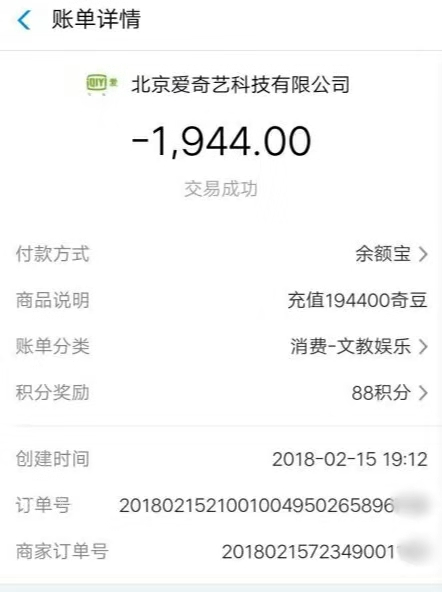 “其中一个主播还和儿子联系,专门教孩子如何打赏给他。”孟女士说,经过将涉及爱奇艺的“消费”记录仔细查看,发现仅仅在2018年2月14日当天晚9点至晚11点21分期间,账户内就有22笔扣款,总共支出9943元,全部购买了爱奇艺的“奇豆”。在2月15日上午10时许,半小时时间内,账户支出7笔(每笔648元)共4536元,下午5点多又“消费”5笔,全天支出7776元。