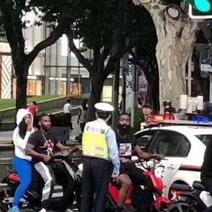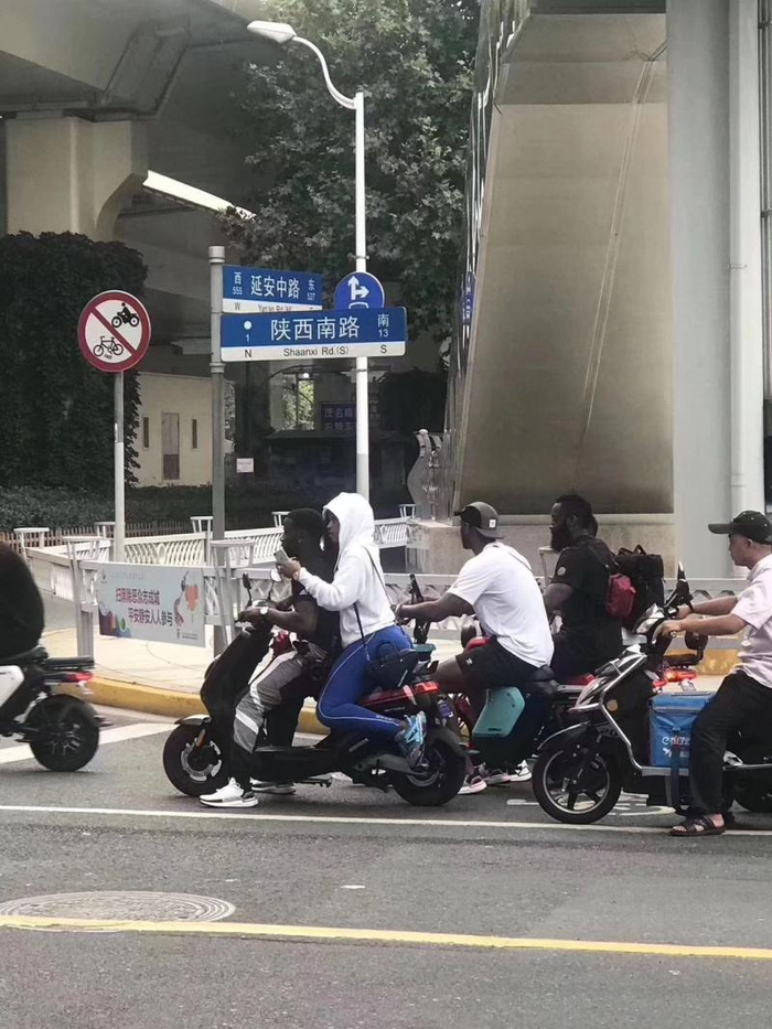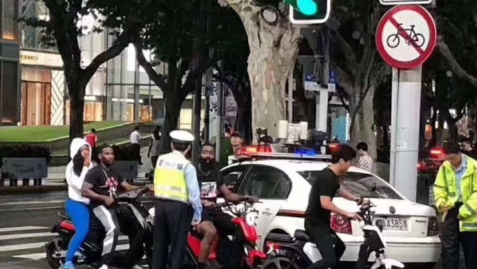 今天下午14时许,哈登和友人一行骑电动车行驶在上海街头,其中一位友人车上还载了一位女士。经过南京西路铜仁路路口时,哈登等人被交警拦下。该路段为禁行路段,而且根据我国道路交通安全法规,电动自行车后座上不能搭载12周岁以上的乘客。