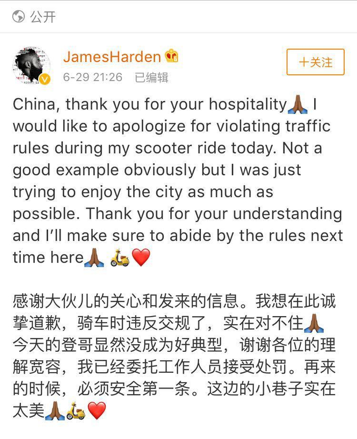 今晚21时26分,哈登通过微博回应:感谢大伙儿的关心和发来的信息。我想在此诚挚道歉,骑车时违反交规了,实在对不住。今天的登哥显然没成为好典型,谢谢各位的理解宽容,我已经委托工作人员接受处罚。再来的时候,必须安全第一条。这边的小巷子实在太美。