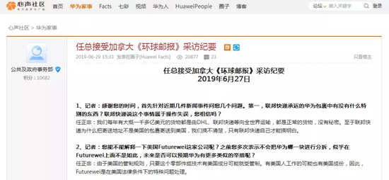 6月29日下午,华为心声社区发布了日前任正非在接受加拿大《环球邮报》采访时的纪要。在采访中,任正非就联邦快递、实体清单、华为专利费、5G、孟晚舟事件、加拿大投资等众多问题进行了解答。