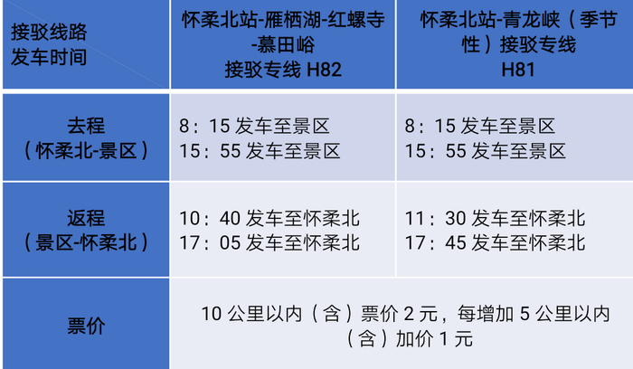 4. 景区公交接驳:以上景区在怀柔北站设有公交车,乘客出站后在广场可乘车直达景区:前往慕田峪长城、雁栖湖、红螺寺可乘坐H82路公交直达,前往青龙峡可乘坐H81路公交直达。