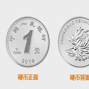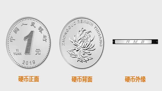 2019年版第五套人民币1元硬币,保持了1999年版第五套人民币1元硬币外形、材质、外缘特征、“中国人民银行”行名、汉语拼音面额、人民币单位、花卉图案、汉语拼音行名等要素不变,调整了正面面额数字的造型,对背面花卉图案做了适当地收缩,直径由25毫米调整为22.25毫米,正面面额数字1轮廓线内增加了隐形图文人民币货币符号¥和1,边部增加圆点。