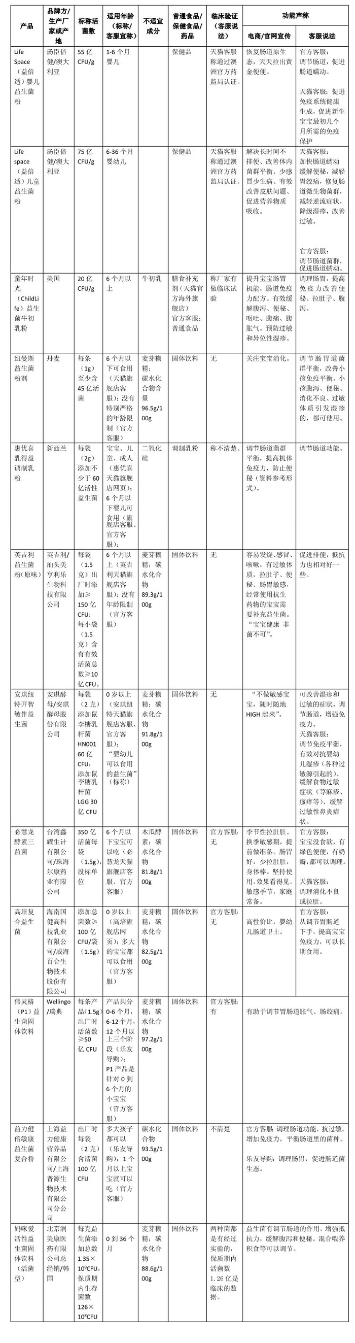部分婴幼儿益生菌产品情况表