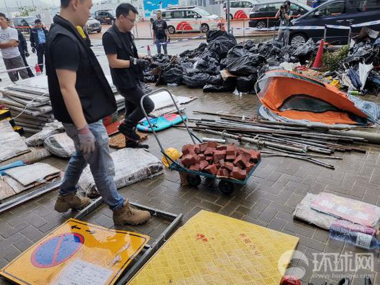暴力冲击的作案工具包括从附近工地或建筑里拆卸出来的铁棍,脚手架,地砖,雨伞等,有知情人告知冲击立法会的示威者当晚的作案工具都是就地取材。↓