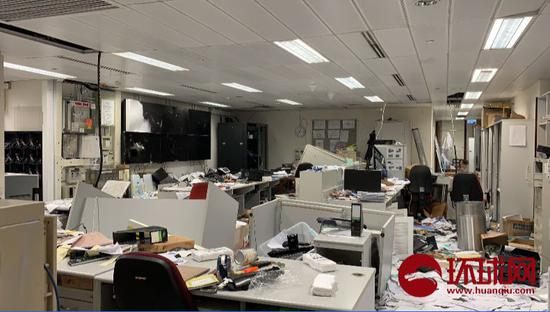立法会秘书室的监控系统被破坏,满地散落着文件。